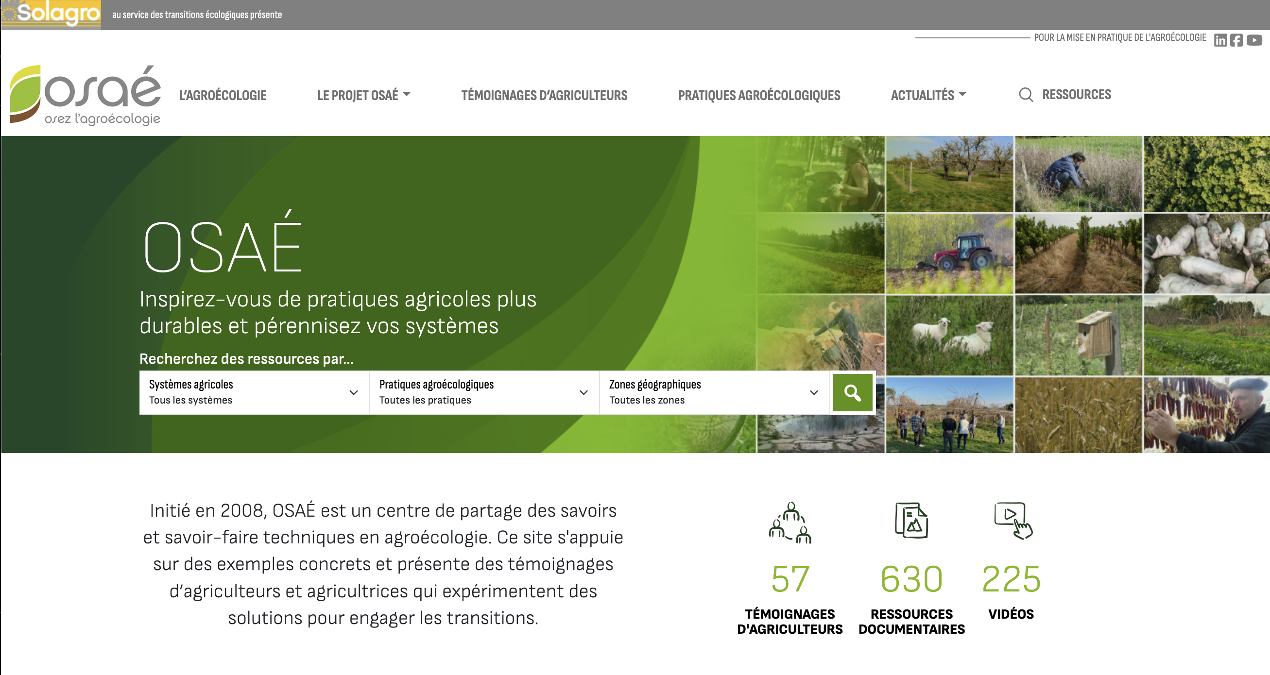 Conçu pour les agriculteurs, agricultrices et professionnel·les du monde agricole, la plateforme Osaé partage des contenus inspirant la transition vers des pratiques agricoles durables, avec près de 60 témoignages d’agriculteurs et agricultrices, 220 vidéos pédagogiques et plus de 600